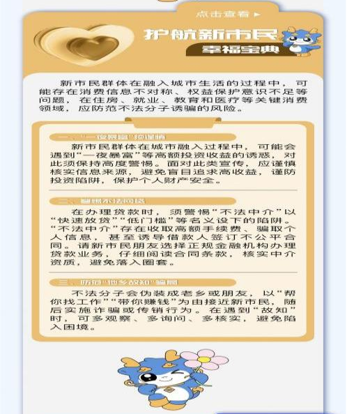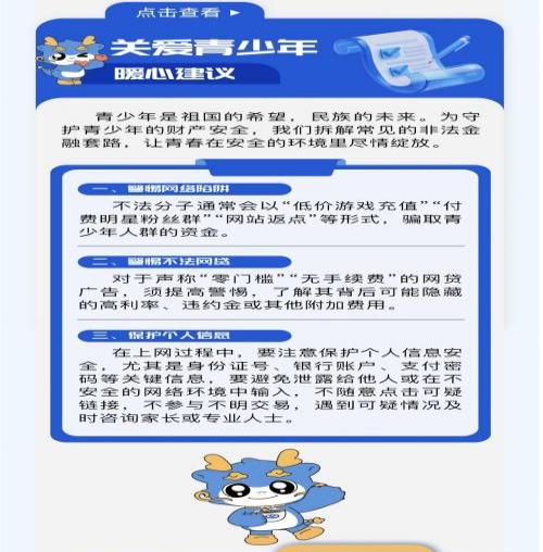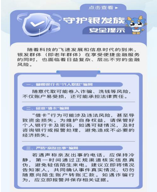 总行聚焦“老少新”重点群体,精心准备“资金安全”防护指南,帮大家扎紧资金安全的“防护网”。聚焦不同群体,原创设计《守护银发族安全提示》《关爱青少年暖心建议》《护航新市民护航宝典》三套电子折页,对应风险防范指南,嵌套于微信帖中推广宣传,提醒广大群众远离风险隐患,守护好资金安全。