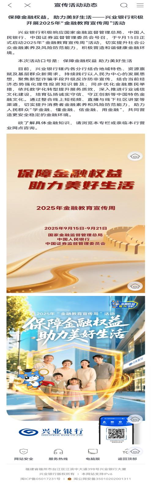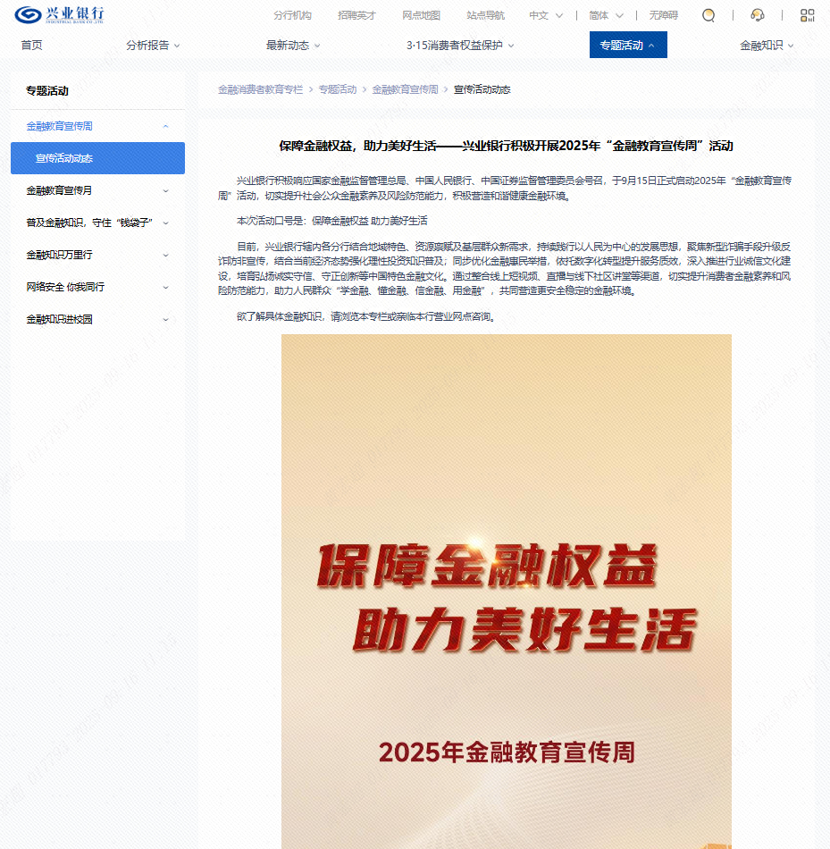 兴业银行积极响应监管部门号召,全面启动2025年金融教育宣传周活动,以“保障金融权益 助力美好生活”为活动口号,紧密围绕活动主题,总分协同,线上线下全渠道共发力,打造浓厚宣传“氛围感”,切实帮助广大人民群众“学金融、懂金融、信金融、用金融”。