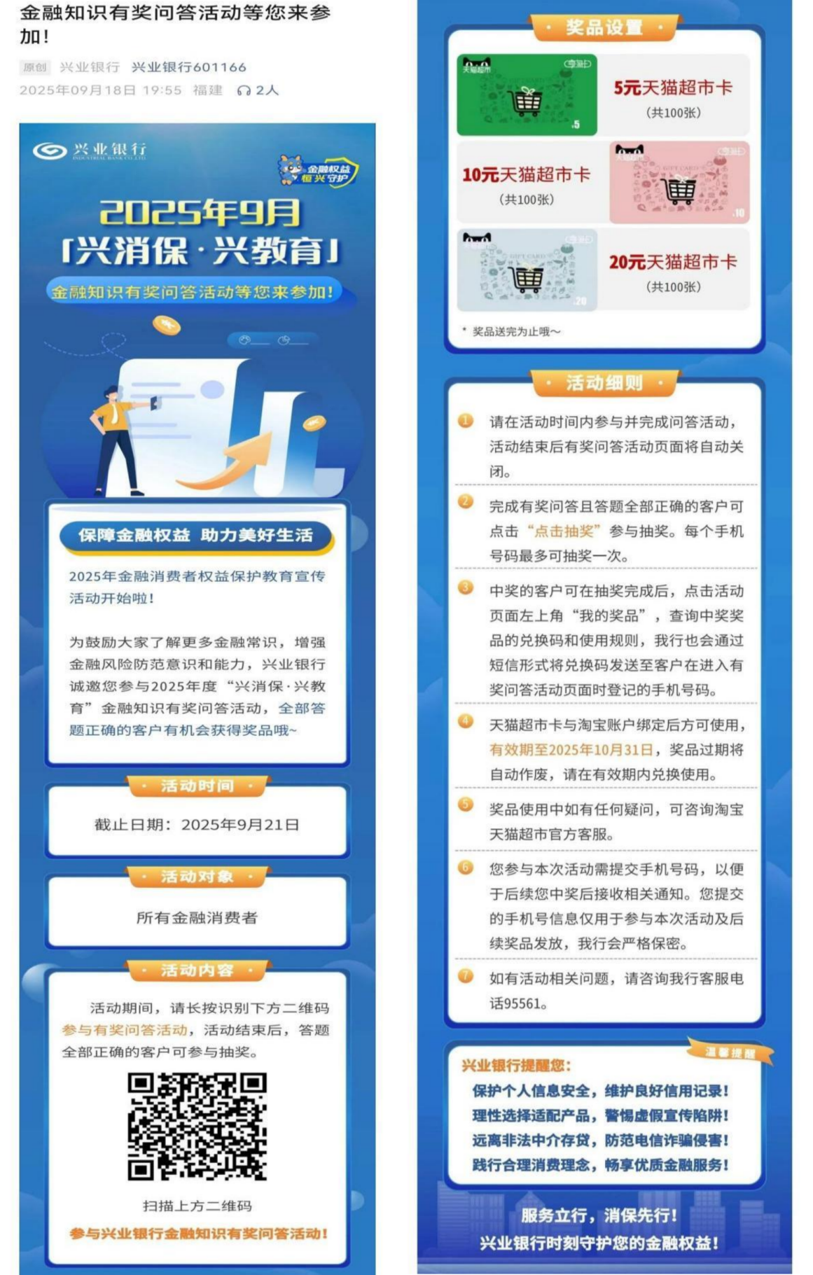 该活动以微信帖形式在兴业银行官方微信公众号上推出,号召全行员工积极向客户推广宣传,答题内容涵盖账户安全、个人信息、电信诈骗防范等金融知识要点,加强金融风险提示,以奖励的形式吸引消费者广泛参与,扩大金融知识宣传活动覆盖面,提升消费者金融风险防范能力,强化消保教育宣传实效。