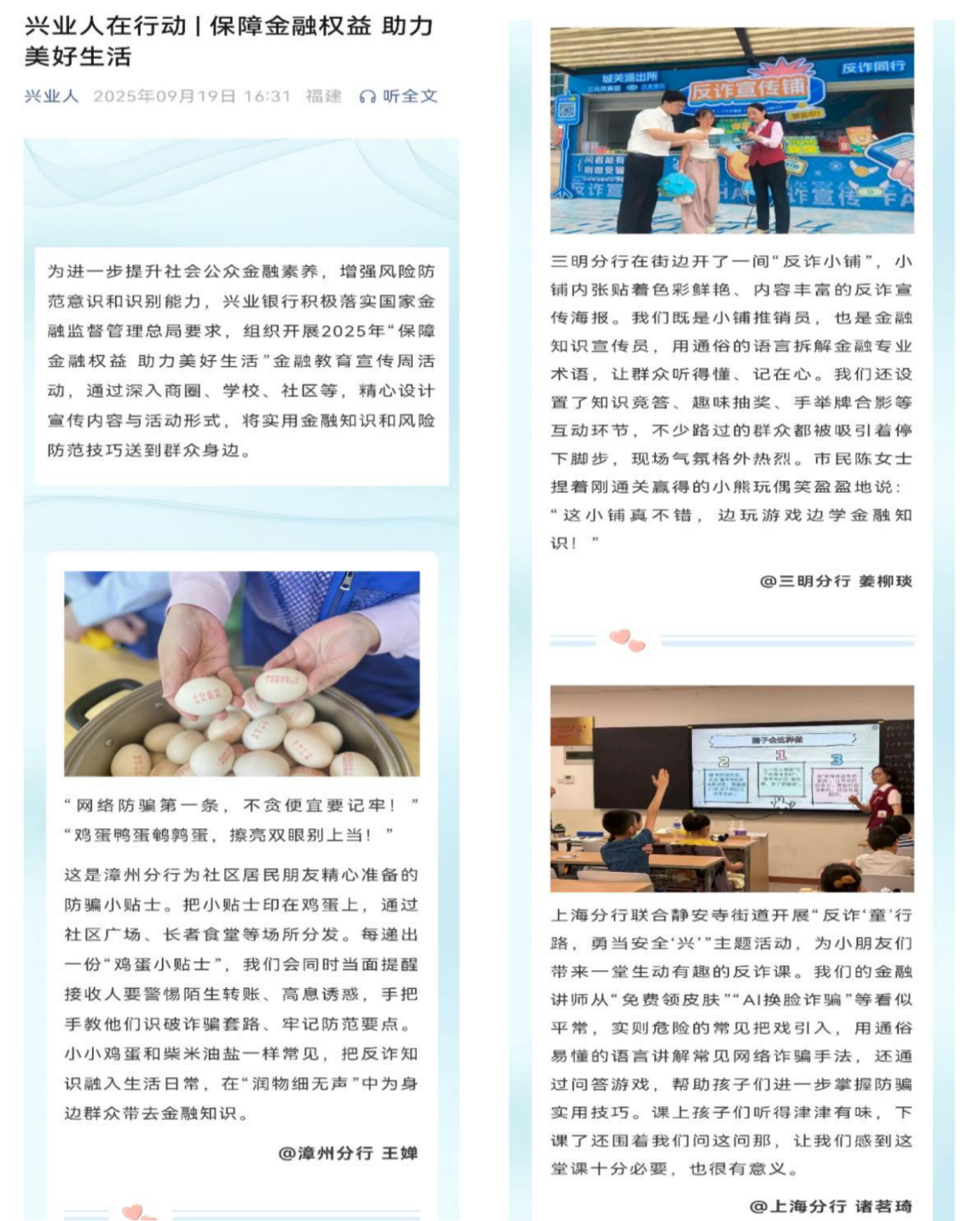 9 月 19 日,兴业银行总行在官方微信公众号发布《兴业人在行动|保障金融权益 助力美好生活》专题文章,全面呈现了各分行在金融教育宣传周期间的精彩活动。